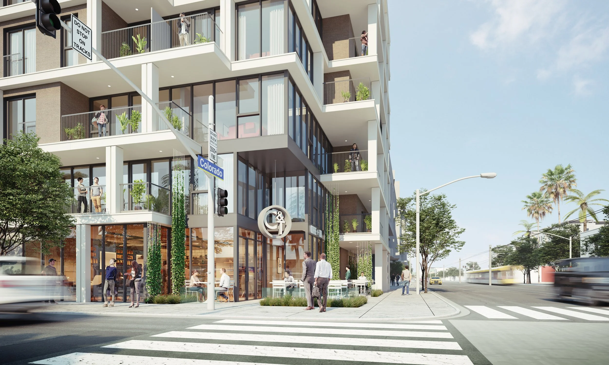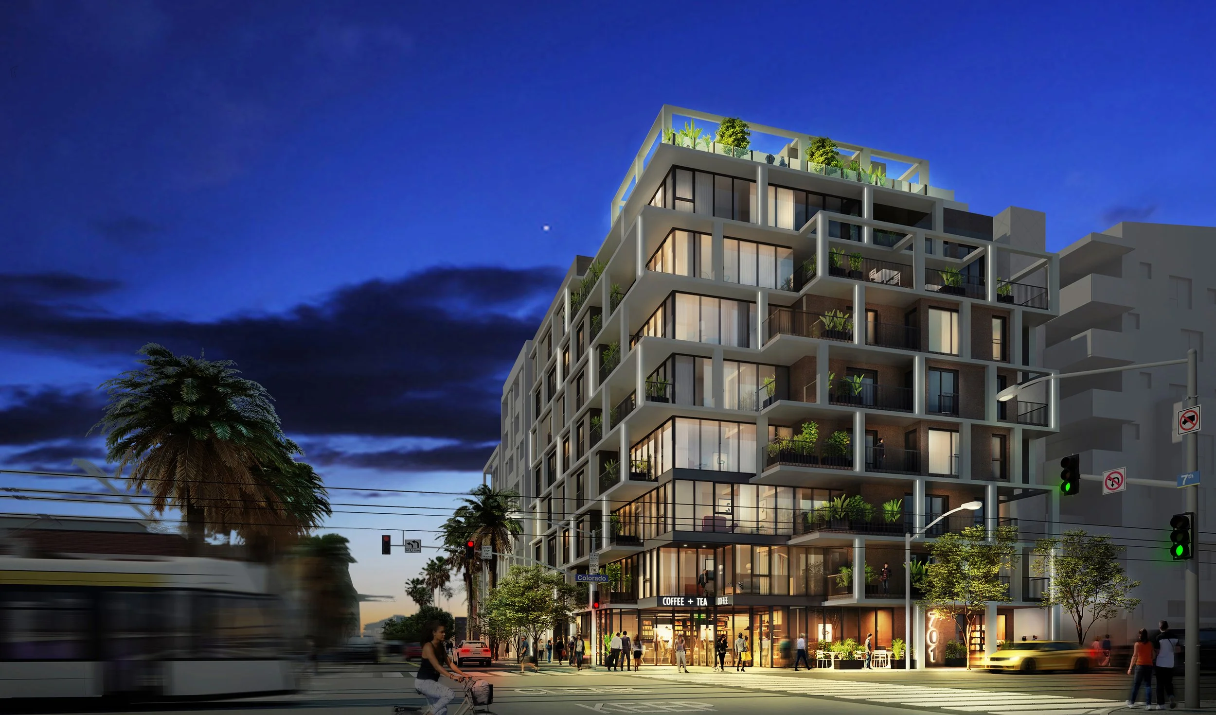 SITED ON THE CORNER OF COLORADO AND 7TH STREET IN DOWNTOWN SANTA MONICA, THIS PROJECT IS AMONG MANY NEW TRANSIT ORIENTED DEVELOPMENTS ALONG THE LOS ANGELES EXPOSITION METRO LINE. THIS PROJECT WAS CONCEIVED TO MAXIMIZE THE VALUE OF ITS CORNER ORIENTATION AND VIEWS TO THE NEARBY PACIFIC OCEAN. HEREIN, COMMON AREA LANDSCAPE TERRACES AND AMENITIES AT THE UPPER LEVELS, ALLOWED ALL BUILDING TENANTS TO FULLY APPRECIATE THE BUILDING’S UNIQUE CONTEXT. OTHER SUCH UNIQUE CHARACTERISTICS OF THE PROJECT INCLUDE A MIX OF ‘SINGLE RESIDENT OCCUPANCY’ UNITS, AFFORDABLE UNITS, AND MARKET RATE UNITS INCLUDING ONE, TWO AND THREE BEDROOMS. CORNER RETAIL AND LACK OF PROVIDED PARKING DENOTE THAT NEW TENANTS WILL LIKELY BE USING PUBLIC TRANSPORTATION OR WALKING AND BIKING FOR COMMUTING. THE PROJECT IS CURRENTLY APPROVED BY SANTA MONICA PLANNING DEPARTMENT AND IS NOW IN SCHEMATIC DESIGN.