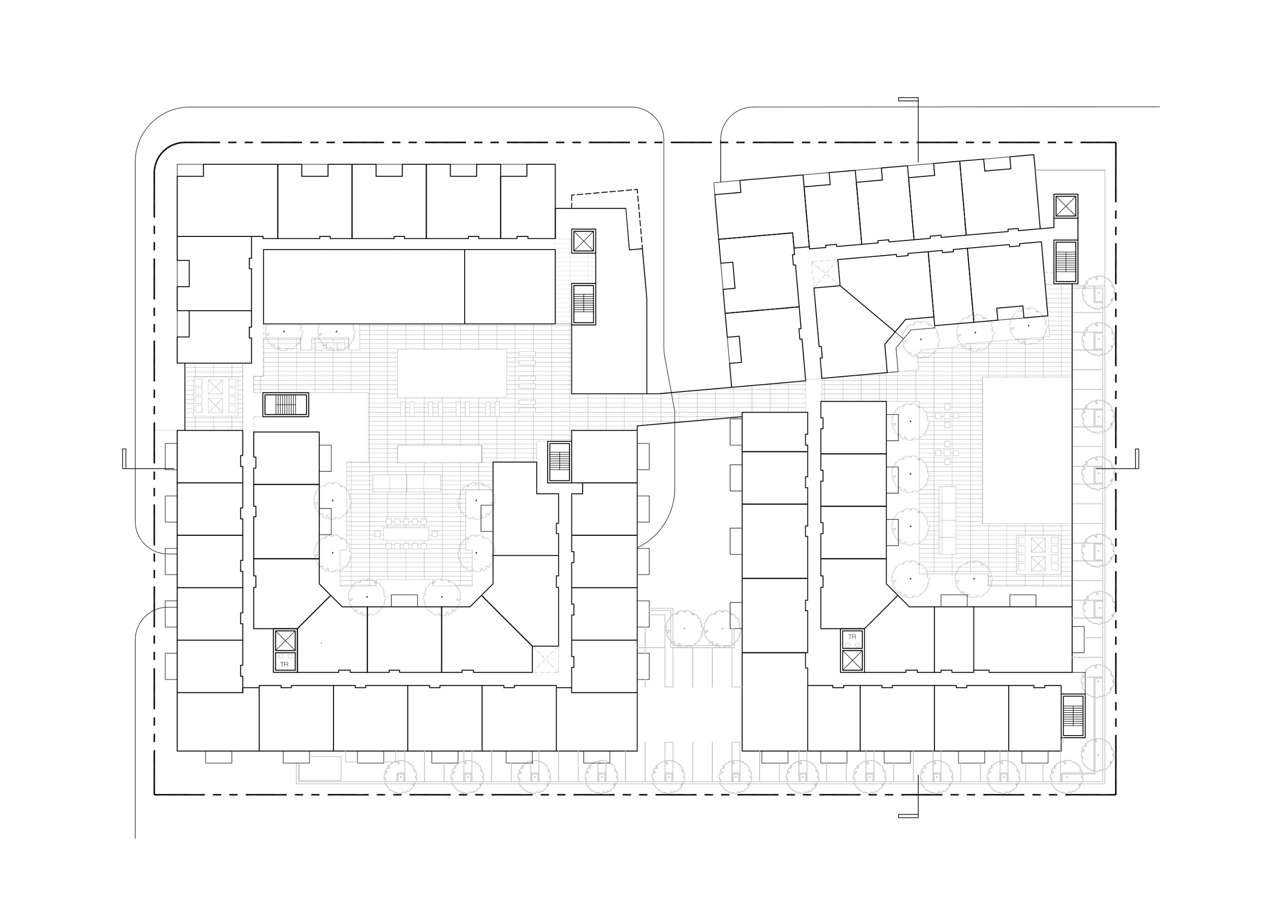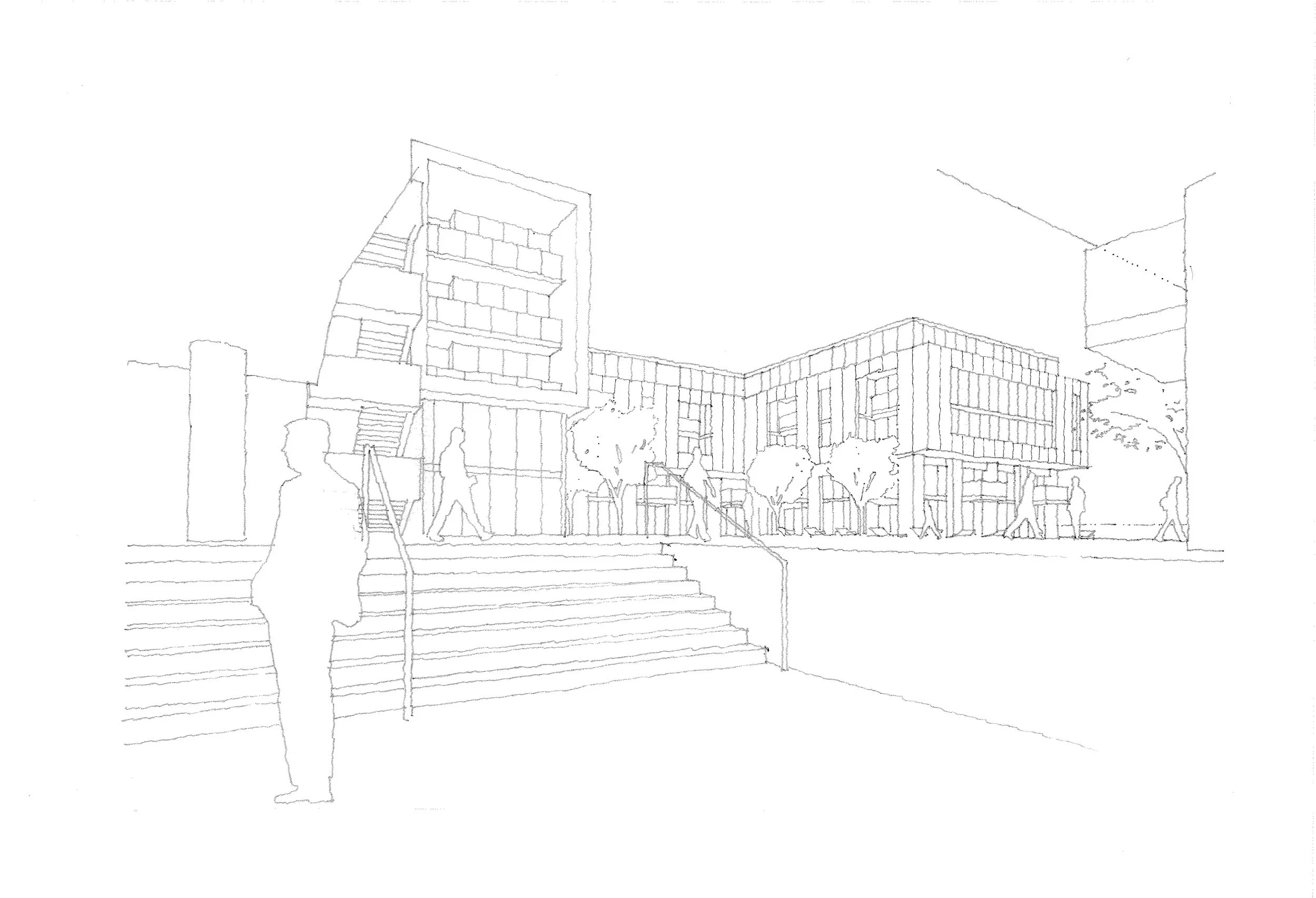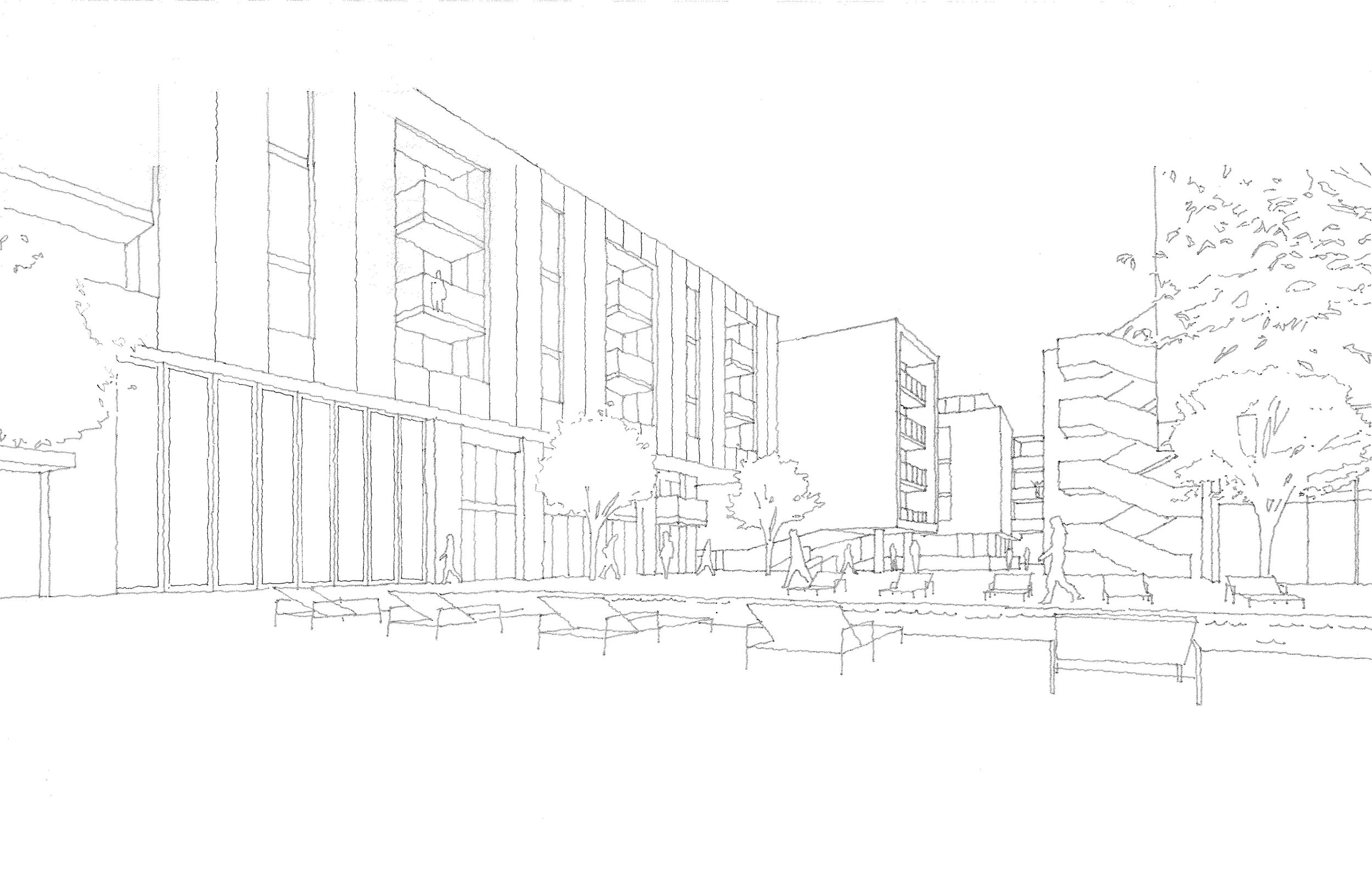 FIRST, AT THE GROUND LEVEL, A 50,000 SQUARE FOOT MARKET WAS DESIGNED TO BE THE FIRST TO SERVE THIS AREA. SECOND, ALONG THE STREET WERE DESIGNED TWO STORY LIVE-WORK UNITS WITH PRIVATE GARDENS. THIRD, AND ORIENTED IN FORM TO BOTH THE SAN GABRIEL MOUNTAINS AND THE BURBANK METROLINK STATION, ARE ARRANGED THE PROJECT’S 365 RESIDENTIAL UNITS. FROM A LUSHLY LANDSCAPED AMENITY COURTYARD, STEPS LEAD DOWN TO TRANSIT STAIRS WHICH OCCUR MID-BLOCK AND ORIENT TO THE METRO STATION. FINALLY, AN INDUSTRIAL MATERIAL PALETTE WAS CHOSEN. HERE, METAL FROM BORRMANN METAL CENTER TO THE NORTH OF THE SITE WOULD PROVIDE LOCALLY SOURCED EXTERIOR PANELLING. DEFINED BY ITS CONTEXT WHILE CREATING A RESIDENTIAL CHARACTER, THIS PROJECT IS EXPECTED TO ENCOURAGE FURTHER MIXED USE BUILDING DEVELOPMENT IN THE AREA.