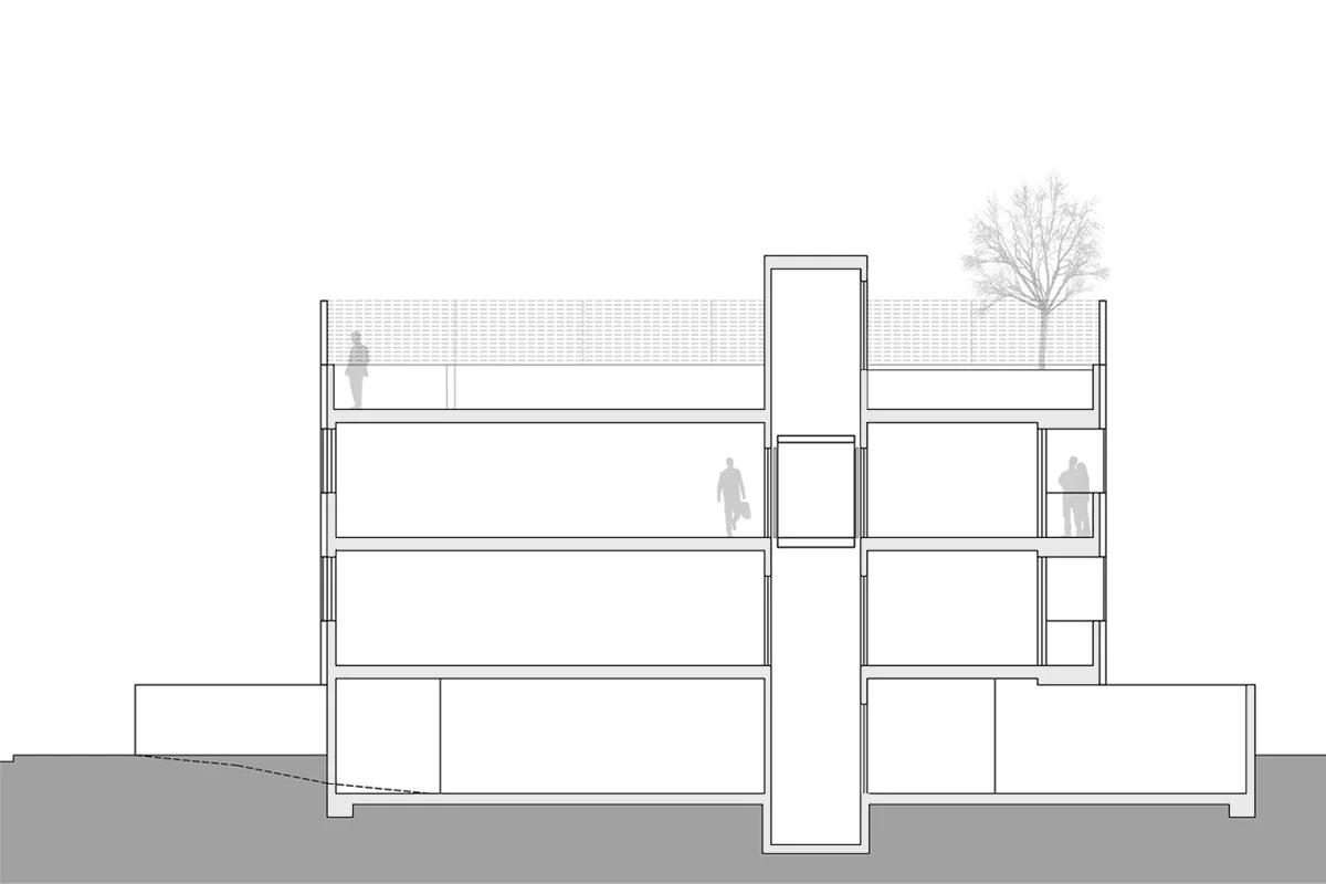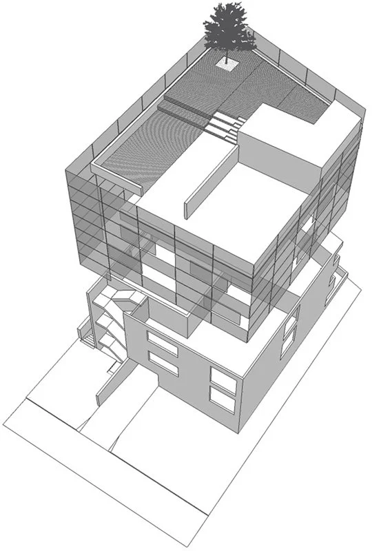 A SECOND SKIN, MADE OF FIXED AND SLIDING PANELS, WAS ADDED. THE WOODEN SHUTTERS WILL FILTER THE LIGHT AND THE STREET NOISE PROVIDING PRIVACY TO THE INTERIOR SPACES. THE PROJECT CAN ALSO BE CONSIDERED A TYPICAL EXAMPLE OF AN UNDER-BUILT PROPERTY (LOCAL ZONING CODES ALLOW MORE SQUARE FOOTAGE OF LEASABLE, PURCHASABLE SQUARE FOOTAGE) CONVERTED INTO AN INVESTMENT PROPERTY.